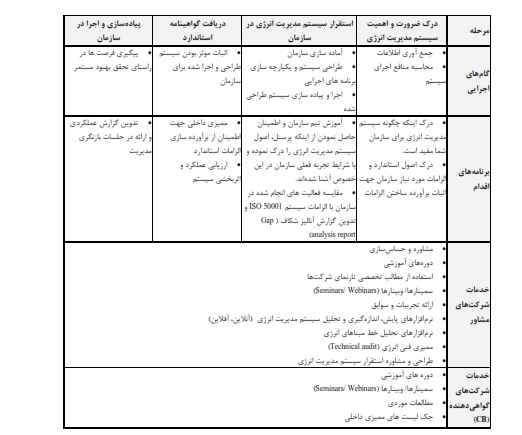 سيستم مديريت انرژي بر پايه استاندارد ISO 50001: 2011 ماحصل بهترين تجربيات جهاني مديريتي و فني در اين حوزه بوده و با رويكردي سيستماتيك، ميزان و چگونگي مصرف انرژي را اندازهگيري و پايش مينمايد، رويههاي مربوط به خريد، طراحي، ارتباطات و آموزشهاي انرژي را اصلاح نموده و براي نگهداري و تعميرات انرژي (كنترل عمليات) در مصارف بارز انرژي دستورالعملهاي مشخصي را ارائه ميدهد. در شكل زير وجوه مختلفي كه در سيستم مديريت انرژي تحت كنترل قرار ميگيرند، ارائه شده است.