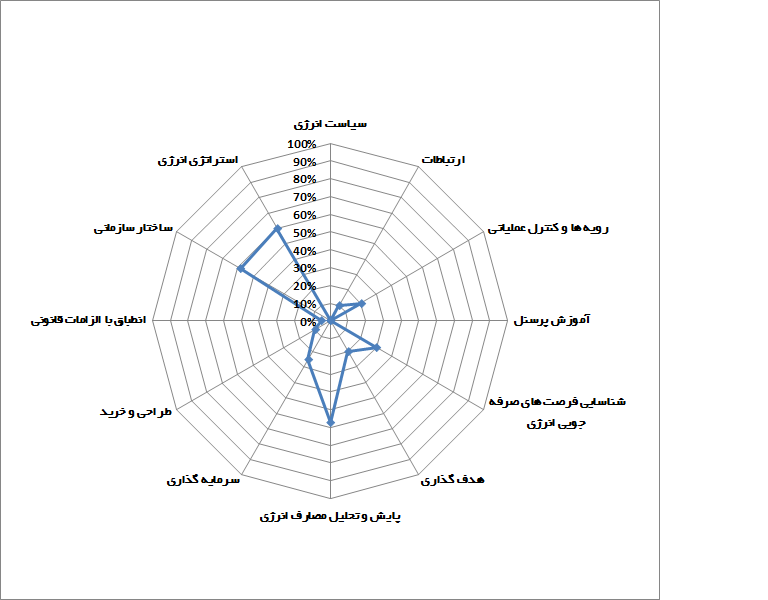 علاوه بر نکاتی که بعنوان الزامات در استاندارد برای تدوین خط مشی ذکر شده است شناخت وضعیت فعلی سازمان و انتخاب استراتژی های مناسب و متناسب با مقیاس، منابع و عملکرد سازمان اهمیت زیادی دارد. برای این منظور می توان از ابزار ماتریس سیستم مدیریت انرژی که چک لیست مبتنی بر واقعیت های موجود سازمان است را تدوین و بر اساس نتایج آن، راهبردهای اصلی را در خط مشی مشخص نمود. نمونه ای از نتایج ماتریس سیستم مدیریت انرژی در شکل زیر نشان داده شده است.