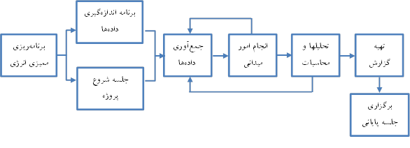 همانگونه که در شکل 1 مشخص است جهت انجام ممیزی انرژی لازم است ابتدا برنامهریزی جهت انجام ممیزی انرژی انجام شود و سپس برنامه جمعآوری دادهها با توجه به جزییات ممیزی انرژی مشخص گردد که لازم است این موضوع در جلسه شروع پروژه نهایی گردد و بعد از آن جمعآوری دادهها و انجام امور میدانی بعمل میآید و در ادامه تحلیلهای لازم و محاسبات انجام میشود و در نهایت گزارش نهایی تهیه و جلسه پایانی پروژه بمنظور ارائه نتایج و دستاوردهای پروژه برگزار میگردد.